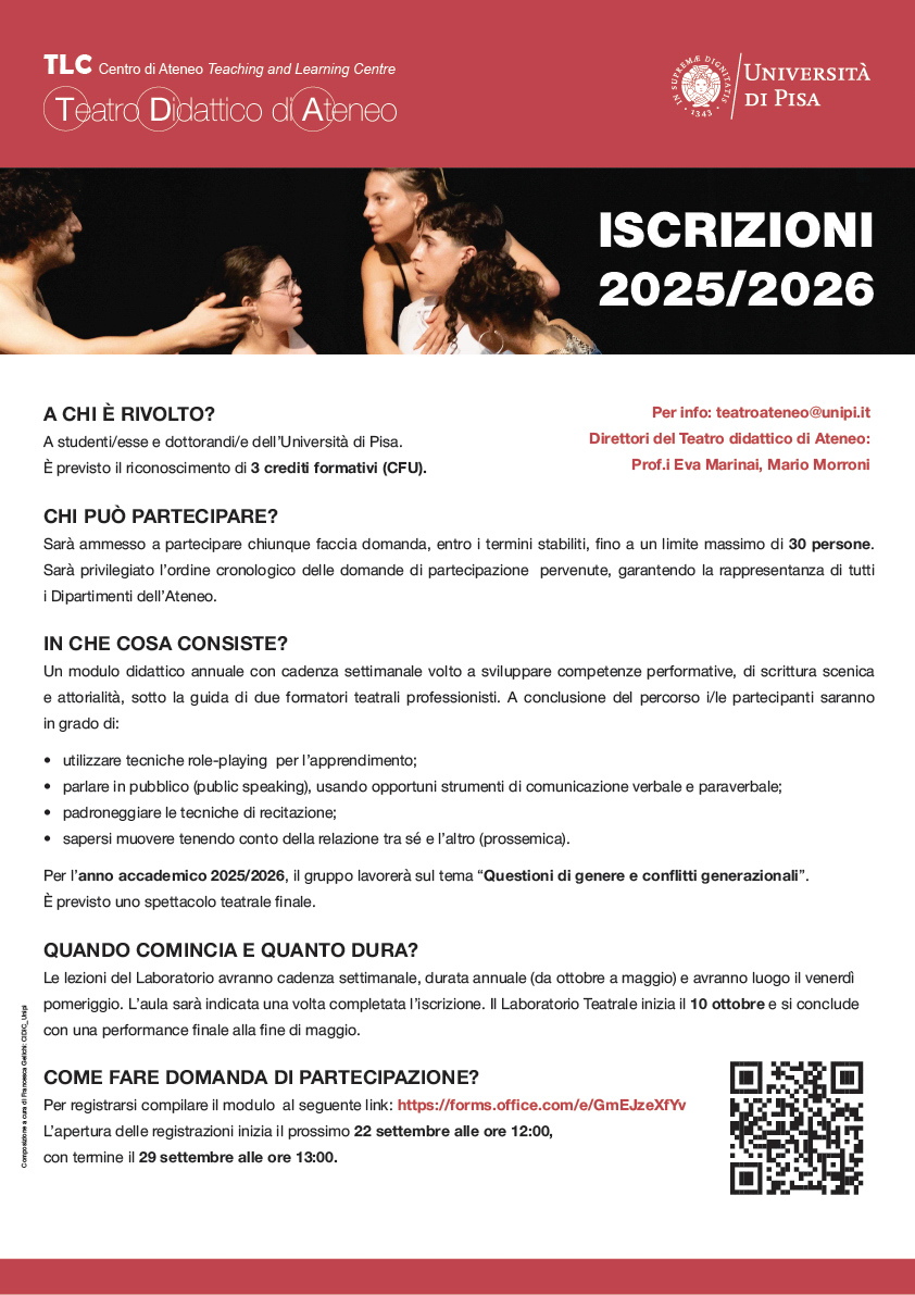 Consulta qui il bando per la domanda di iscrizione all’attività del Laboratorio di Teatro didattico di Ateneo organizzato dal Teaching and Learning Centre per l’anno accademico 2025-2026